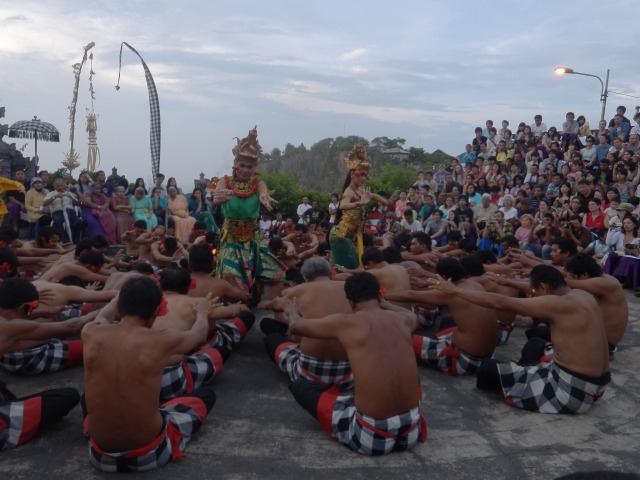 バリ島に旅行した際に生まれて初めてケチャックダンスのライブを見た。ダンサーたちはプロというよりも、昼間の生活と夜のバイトなケチャックダンスという人たちだ。技術的なものよりも一体感が必要なレベルだからそれでいいだろう。それに毎日やっていれば、それなりに巧くなるのも良くわかる。ケチャックダンスはあの有名な群舞だけでなく、それはコーラスのようなもので、メインの芝居をする人たちが別にいて、それは観光客相手ということもあるが、分かりやすくユーモアに富み客いじりもし、仮面やら伝統的な衣装やらいろいろと繰り出してみせてくれた70分だった。向こう側にバリの海とウルワツ寺院を見つつ陽がくれていくなかで見るものでまあ面白かった。ただ、これ劇場で見せられるとどんな感じなるんだろうなあ。分かりやすくいうと、自然という劇場がメインディッシュだった。要は外国のビールはその土地で地元の料理と共に飲むと巧いのと同じ。2012年12月17日@ウルワツ寺院野外劇場 バリ島インドネシア