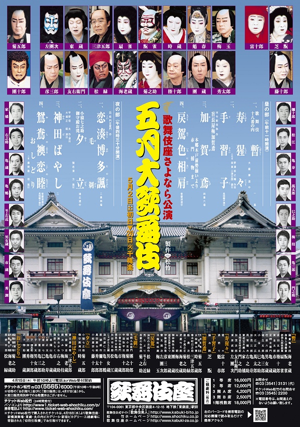 都民劇場の歌舞伎サークルに入った。愛着のある歌舞伎座ともお別れなのでせいぜい多くのものを見ておきたいと思ったからだ。これなら一等席も1万円ちょっとで見られるわけで。今日は前から9列目。ほぼ真ん中の席で大満足。例年5月は団菊祭のはずなのに、そういう名前は外れたのかな?それでも、団十郎や菊五郎など大御所も顔を揃えた。実は今回拝見する四演目はすべて初見。歌舞伎座でこんなことは珍しいのでいやはや面白かった。おしどりだけは他でも見たこと会ったかも。