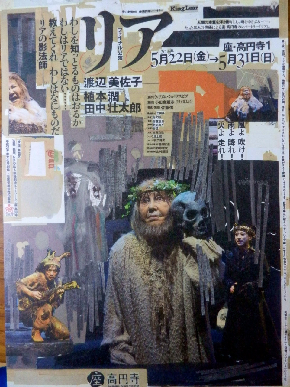 私のリア王観劇歴は幾つかあるが、書いておかなくてはならないのはロイヤルシェイクスピアカンパニーの役者と真田広之、蜷川幸雄演出での「リア王」だ。ナイジェルホーソンというリア王を演じる為に生れてきたような老俳優を使っての上演。こういう体制を作って上演すると、もう誰も批判できない。誉め称える新聞評で埋め尽くされた。僕はそんなにスゴいのだろうか?と思ったけれど。さらに、リア王は、例えば黒澤明が「乱」という映画に、ハーウッド作「ドレッサー」などスピンオフな名作も山ほどある。