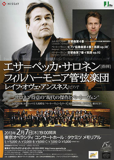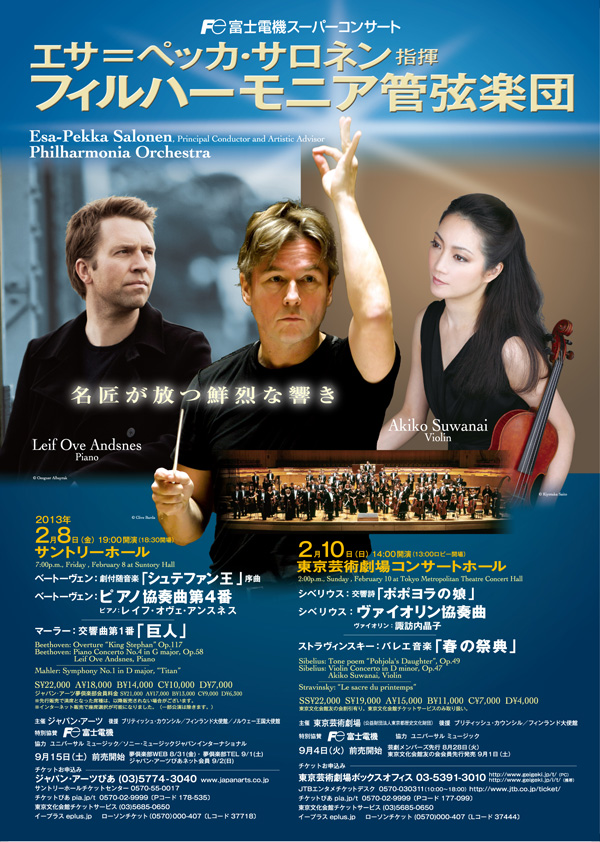 マーラーの巨人はスゴい演奏だった。冒頭の弦は音になるかならないかの掠れているのではないかという音色から始まる。それに色と生命が宿って行く様はたまらなかった。2楽章までは、まるで春が到来し、春が爆発していく感じだった。よく細部まで良く聞こえる演奏といった表現を使う人がいるが、管楽器も打楽器も独立し個性豊かなのに有機的に結びついている旨さはたまらない。俯瞰でみてもクローズアップで迫っても面白いのだ。弦も例えば2楽章の中音域の美しさといったらたまらない。都響のマーラーでも感じられたが、ここでもマーラーというか、ユダヤ節は極力排されていて純音楽演奏の魅力がある。こういう演奏は、マーラーとはこういうものだ。ブルックナーはこういうものだと指揮者による演奏の振り幅が少ないウィーンフィルなどではできない演奏家もしれない。元々は録音オケとして結成されたフィルハーモニア管弦楽団だからできる演奏だと思う。ああ、言って良かった。サロネンは、90年代の初めにロスアンジェルスでロスフィル。2010年にザルツブルグ音楽祭でウィーンフィルと聞いた時にサロネンのこの溢れる才能に気がつかなかった。今宵の演奏で皆が騒ぐ理由が分かった。2013年2月8日@サントリーホール