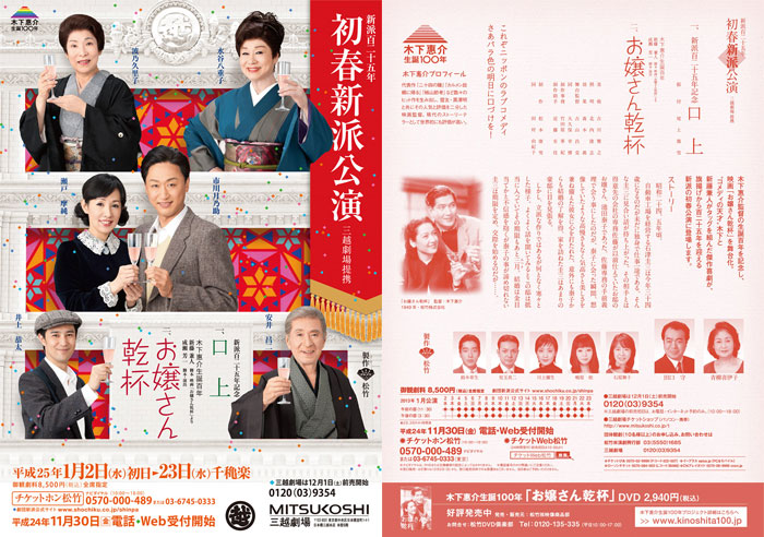 冒頭の口上。15分のものなのだが、歌舞伎の口上のようなものを想像していたら、素晴らしい日舞の披露が主なものだった。新派の俳優さんは皆さん踊りを勉強されているだろうが、なかなかそれを見ることはできない。それを存分に見せて頂いた。正月らしい華やかさが劇場に広がる。実際の口上はさらっとしていてとても良かった。