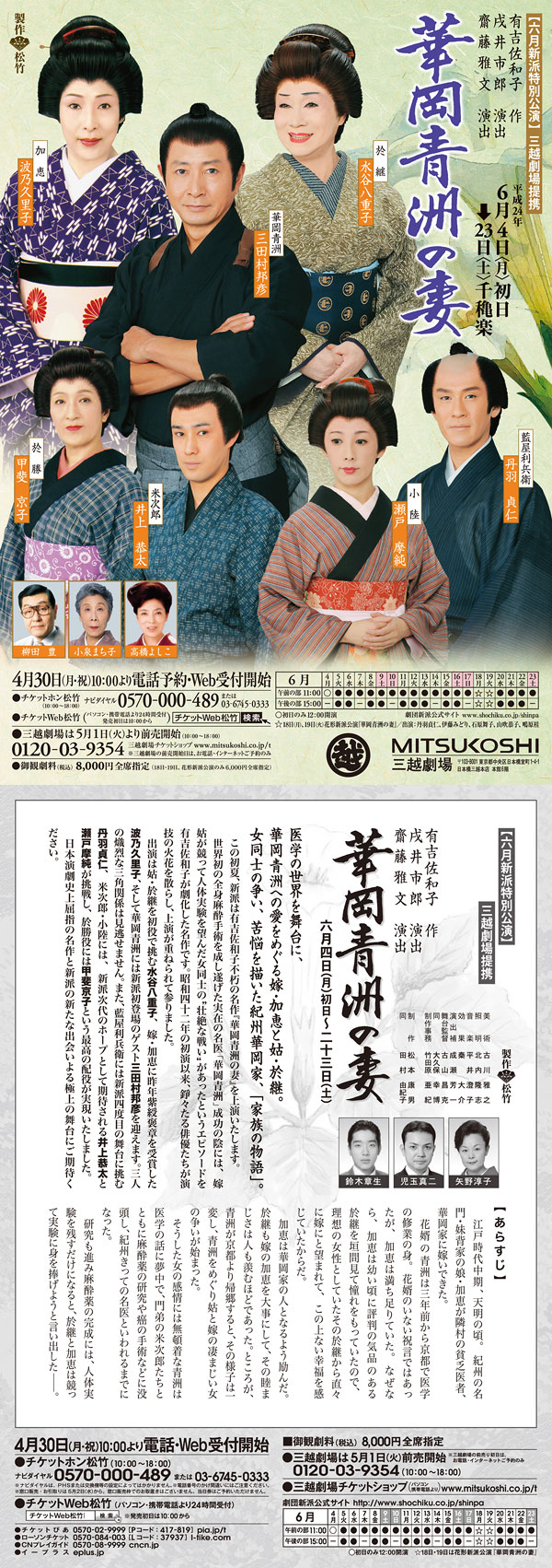 出演は姑・於継を初役で挑む水谷八重子、嫁・加恵に昨年紫綬褒章を受賞した波乃久里子、そして華岡青洲には新派初登場のゲスト三田村邦彦を迎えます。三人の熾烈な三角関係は見逃せません。また、藍屋利兵衛には新派四度目の舞台に挑む丹羽貞仁、米次郎・小陸には、新派次代のホープとして期待される井上恭太と瀬戸摩純が挑戦し、於勝役には甲斐京子という最高の配役が実現いたしました。
