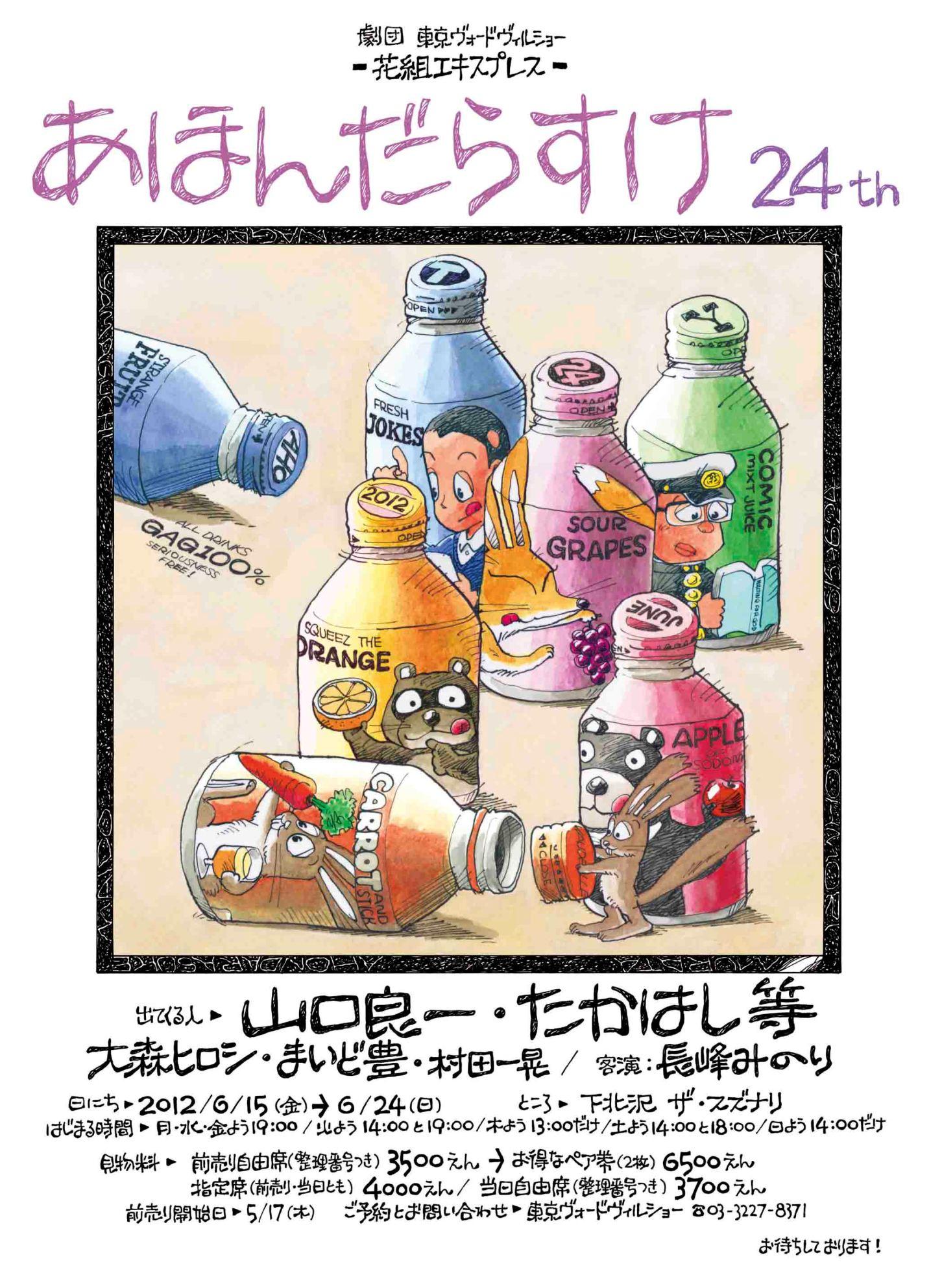 単なる演劇でも、もちろんコントやバラエティーショーとも違う独自の分野である。2年ぶりに拝見した。大いに笑った、楽しんだ。このシリーズは10作以上観ているのだが、今回のはこの7−8年でも最も完成度が高かったように思える。これは1−2年で出来るもものではなく、24年間も続けて来たからこそできるひとつの頂きである。24年間やってきて、毎年洗い直すからできるのだ。ひとつひとつが展開にスピード感満載で、削って磨いたことが伝わってくる。山口良一さんの見事な間合いがスゴい。たかはし等さんの匙加減が絶妙。大森、まいどの自分の立ち位置の取り方。これ案外難しいものだ。僕は今回、一番驚いたのは村田さんが一年観ないうちにどんどんウマくなっていること。何だろう、自然体で舞台にいる感じが強くなった。しかし、この舞台ユルーくやってるように見えて、そんなことは全くない。劇団員だからと、舞台に若手が出られるものではない。出さないのは、ひとえにお客さんにいいものを見せたいという強い意志なのだろう。すごいな。長峰さんはその大役に見事に応えていた。プレッシャーでお腹が痛かったんじゃないか?2012年6月22日@ザ・スズナリ