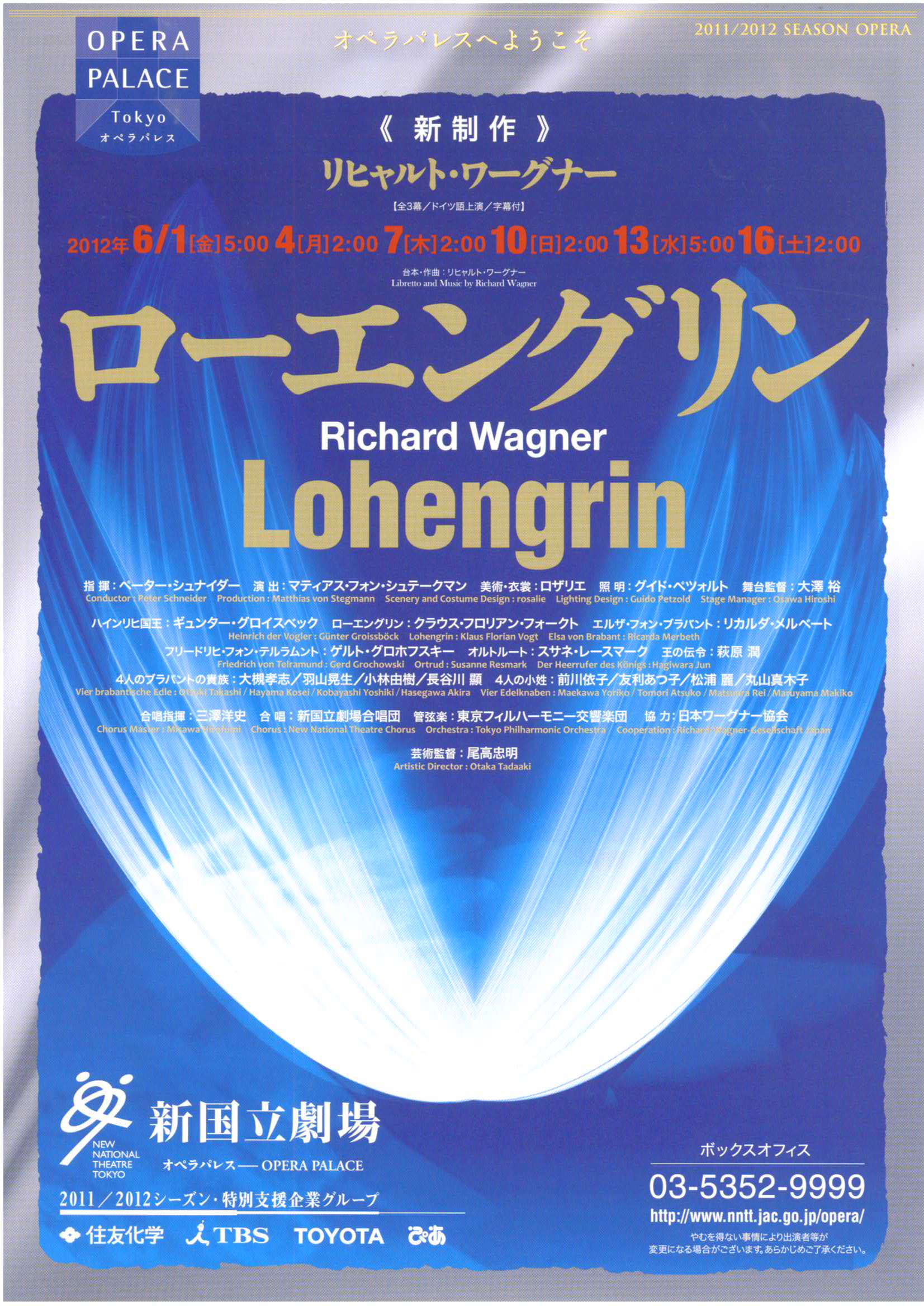 新国立劇場のワーグナーは世界でもトップレベルのものになることがあります。この公演はまさにそれを予感させます。モダンでロマンチックなシュテークマンの演出、フォークトを初めとする現代最高の歌手。そして、今年(2012年)の秋、ウィーン国立歌劇場と来日し、フィガロの結婚を指揮するペーターシュナイダー(既に30年以上、ヨーロッパ最高の歌劇場で指揮をしているドイツオーストリア系オペラの最高峰の指揮者)がタクトを振ります。オケは東京フィル。東京フィルは既に新国立劇場で素晴らしいワーグナーを何回も聞かせています。時にロイヤルオペラなんかより数段いい演奏をします。またシュナイダーとは、交響曲も含めて何回もコラボレーションした周知の関係ということで、いやはや期待は高まる。