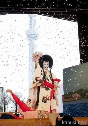 それを非常に分かりやすく魅せてくれたのが、二時間の本編終了後、30分の休憩時間のあとにある25分の浄瑠璃だ。本編をそのまま引きずっての作品だが、最後に舞台奥は放たれ、とんぼ達と江戸歌舞伎の醍醐味を見事に魅せてくれ、それは、スカイツリー、隅田川、そして、桜咲く日本を借景に繰り広げられ、最後に勘三郎は自らの肉体を放り投げて舞うのだ。余りにもの劇空間は中村屋がものすごい極みまで到達したことを宣言した。勘三郎はいろんなことをする。いろんな人と付き合う。しかし、それらは全てただただ歌舞伎のために行なってきたんだ、と分かって涙が止まらなかった。合点がいったぜ、中村屋!