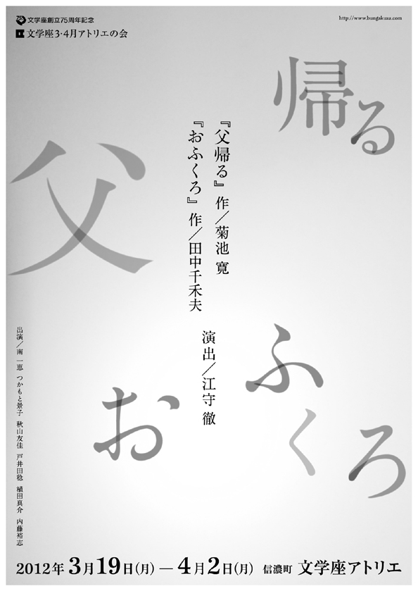 俳優では少し細かなリアクションが多すぎる感じがするが植田真介が2作品とも中心的な存在で「父帰る」では不実な父と、自らの心のうちの対立を、「おふくろ」でも母との距離を取りあぐねている青年を見事に演じた。女優3人はみな達者であり、80年も前の作品をユーモア溢れる現代の作品として見事に咲かせてみせた。普段の文学座の公演であまりお見かけしない方なのでこの劇団の層の厚さを再認識させられた。江守徹の演出は、シンプルなほぼ素舞台に近いところで見事に俳優の演技に観客が集中できるものであり、スピード感もありいやはやこれまた見事である。2012年3月31日@文学座信濃町アトリエ