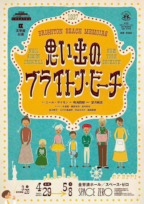 ニールサイモンの傑作戯曲。東海岸のユダヤ人家庭の日常を描きながら家族や生きることを問いかける。笑いも涙もある7人の物語。こういうのを書けるようにならないとなあと思ったり。しかし、今の東京であれだけ観客に向かって独白の台詞書いたら馬鹿かとか言われちゃうのかなあとも思ったり。演出は手堅く、美術は二階建てで必要なものがちゃんとあって。10年ほど前に坂口さんの演出での上演されているはずなのだが、どう違うのか。この作品を舞台で見るのはこれが初めて、おおよそのストーリーなど知ってはいたが、やはり人間の肉体を使って表現されるといいです。宮内さんが15歳に見えないのが残念。文学座の力量はやはりすごいと思わせる公演。