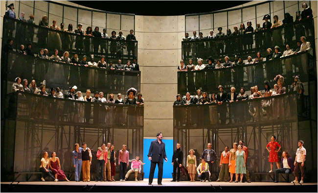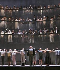 まるっきりウエストサイド物語であり、歌あり踊りありのミュージカル仕立てだった。先ずはそれを見ように酔っては素舞台に近い美術で、舞台を上下させる方法であの巨大な空間を縦横無尽につかったアイデアを買いたい。歌唱や踊りもブロードウェイの直後だけにアレレなのだが、そこに若い役者が込めようとしている気持ちや、ステージ上で役者通しが非常に信頼しあって演技しているのも伝わってきた。