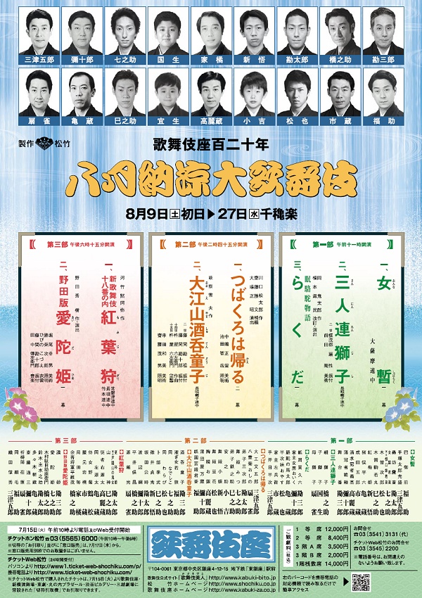 8月の歌舞伎座は、伝統に根ざしていながらも、新しい息吹を感じさせるものであります。美術も衣装も音楽も。新春の浅草や国立劇場がホント歌舞伎を継承することとか、歌舞伎役者のための公演に偏りすぎることがあるけれど8月の歌舞伎座は素晴らしい。大満足。